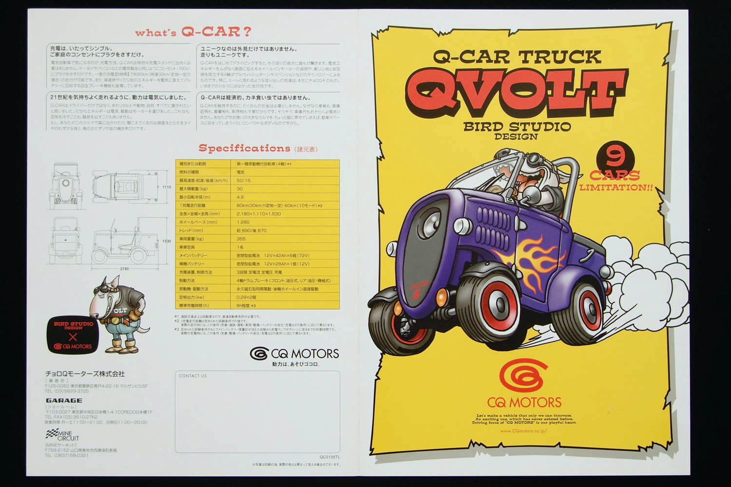 Of the successive Q cars created by Choro Q Motors, the QVOLT was the last mass-produced commercial model. All previous Q cars were designed in-house, but the QVOLT, as mentioned above, was designed by manga artist/designer Akira Toriyama.