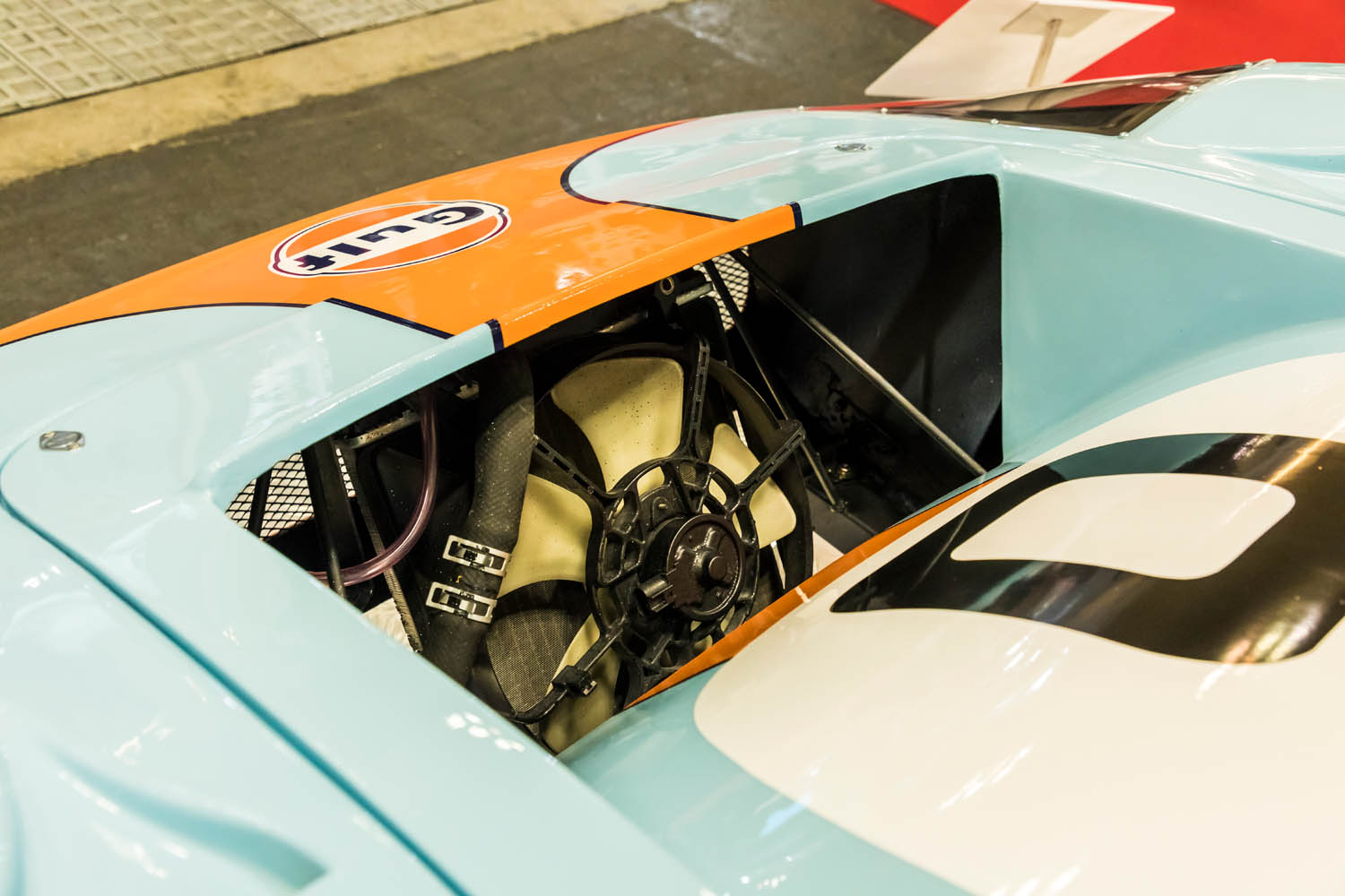 Recreation of the Le Mans-winning car in bright blue and orange Gulf colors