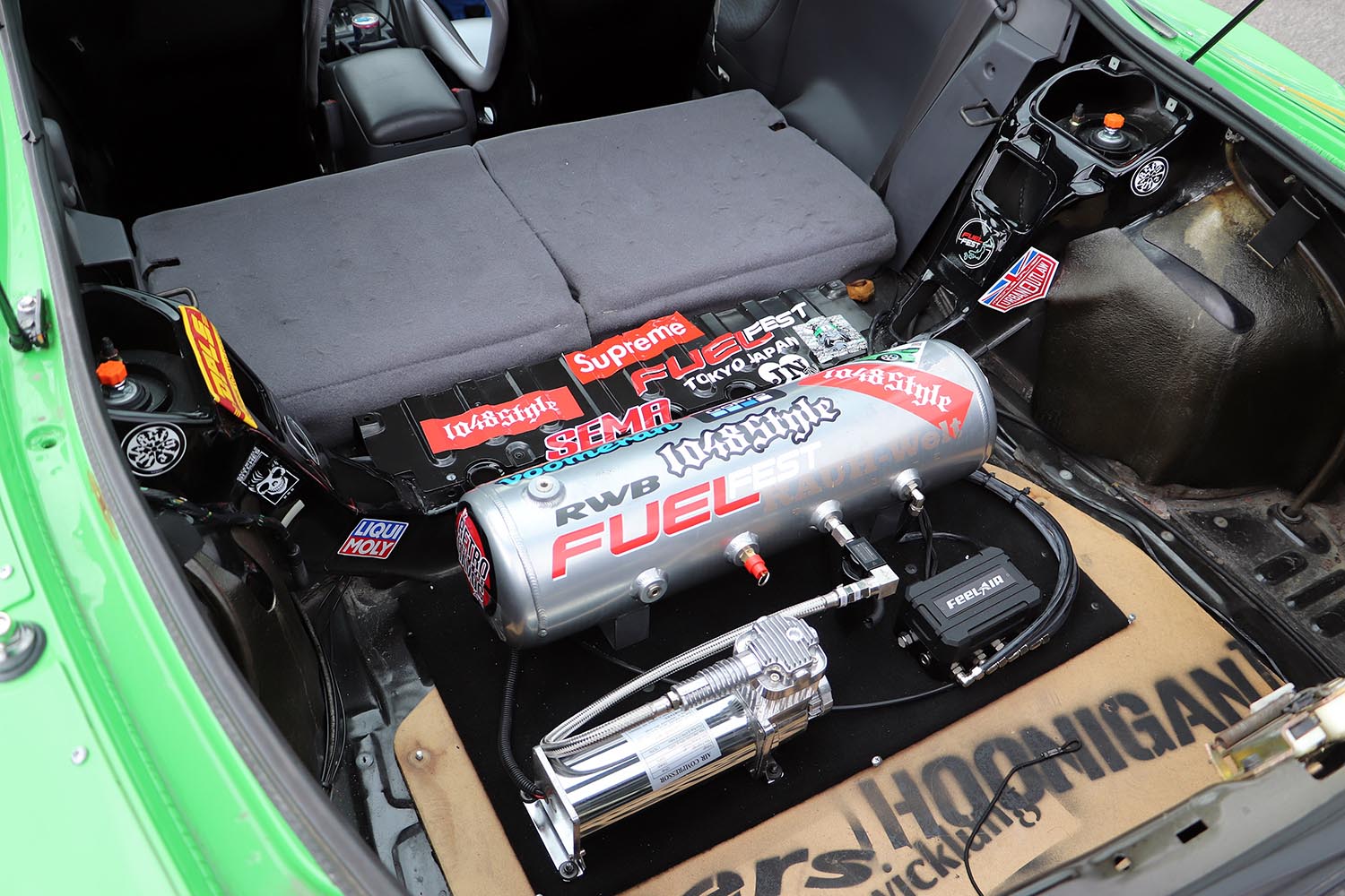 As for the suspension, a standard air suspension is set up and can be raised or lowered as required. In reality, we would have preferred to stick to the raw suspension with a coilover kit installed, but since this car is used mainly for events with almost no daily driving, we decided that the air suspension would be more convenient for transport and loading.