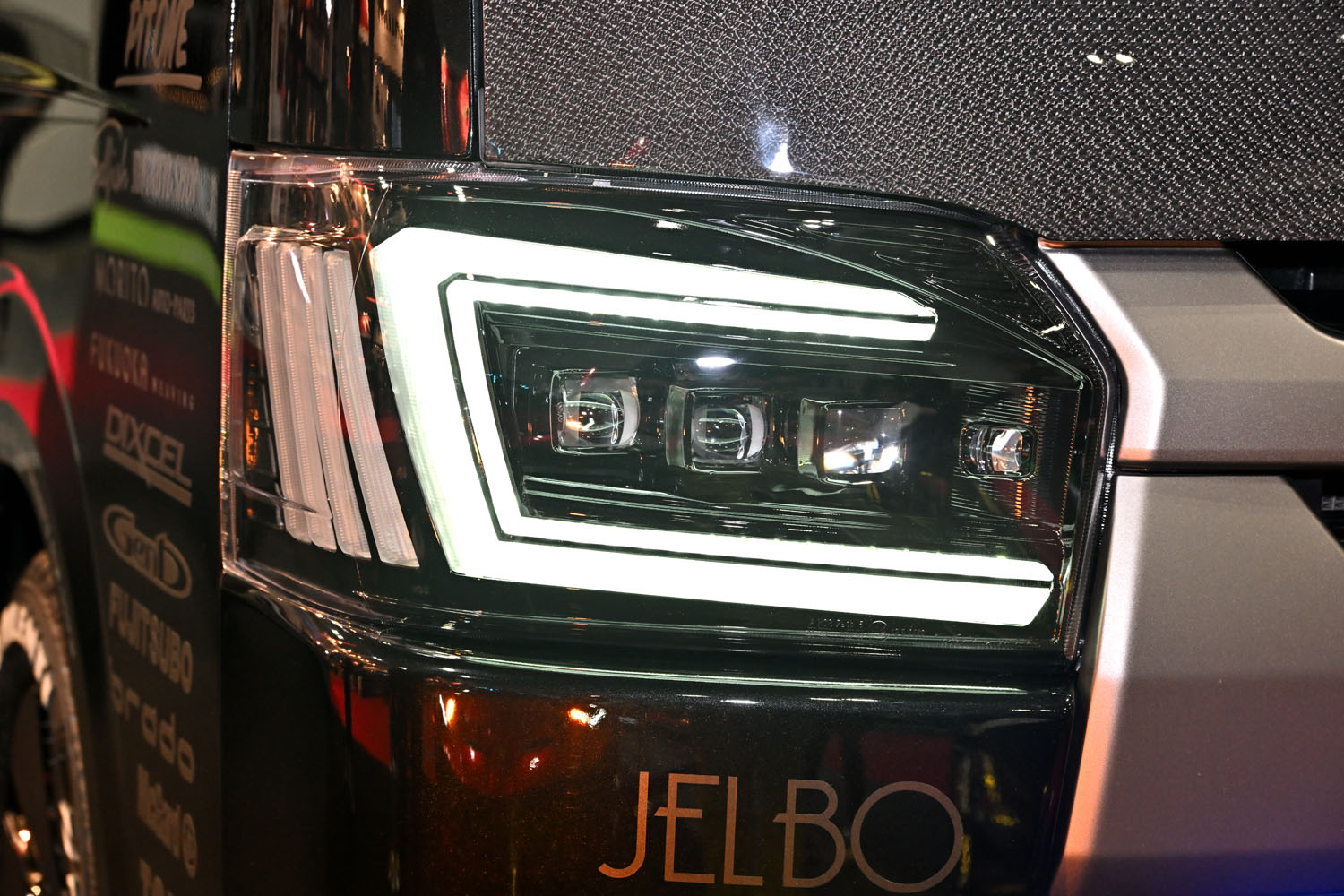 The Hiace, equipped with special tires and wheels, was fitted with the new Jewel Headlamp ULTRA. The line-up already includes six-lamp type LED headlights arranged in two tiers above and below, but the new model is a single-tier, three-lamp type, with the position and indicator parts surrounding the headlights in a C-shape and the indicator part being a sequential type.