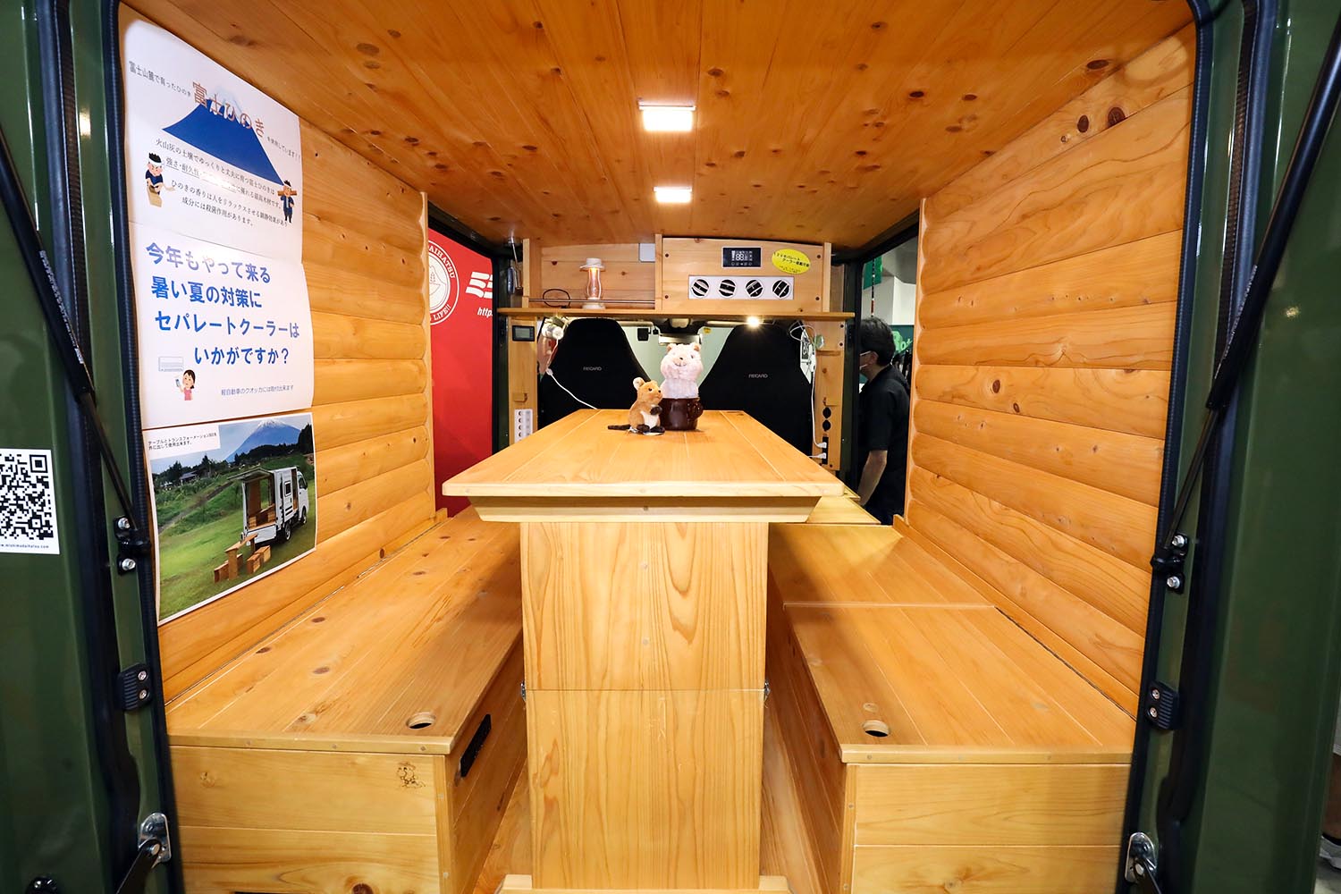 In honor of such a cute and lovable quokka, Mishima Daihatsu named its original camper “Quokka Wannabe”. The base vehicle is a Daihatsu Hijet Panel Van. Quokka, a resident of the Australian forest, fits perfectly with the image of the camper model, which is made from plenty of Japanese cypress grown in the wilds of Fuji.