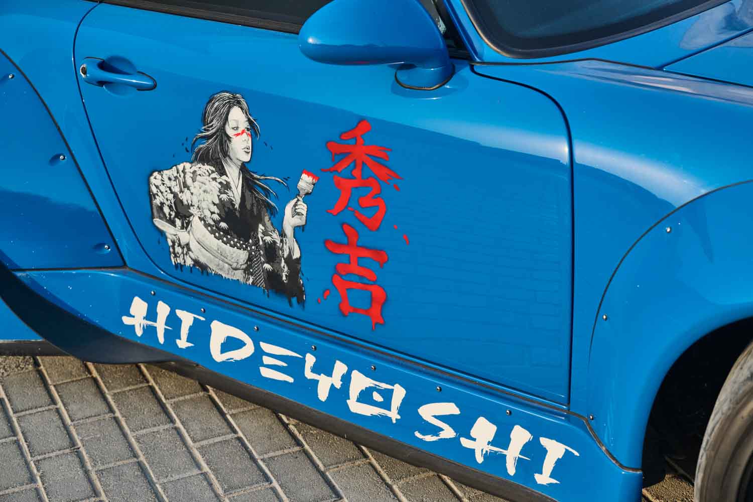In June 2021, Japanese street artist Roam Couch, who is known for his free wall art in and around the town of Anpachi in Gifu Prefecture, will paint a stencil of Hideyoshi Toyotomi on both the left and right doors, with the words HIDEYOSHI and Hideyoshi. The car was completed with dynamically shaped aero parts by RWB.