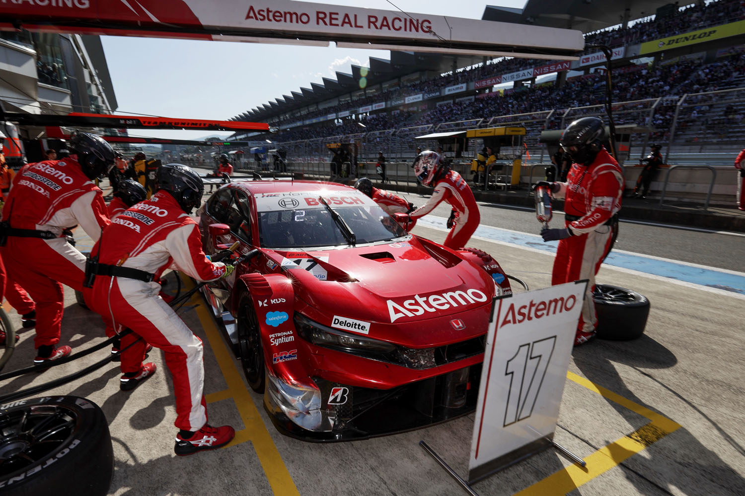 It was the Honda Civic Type R-GT that showed speed in GT500 qualifying. Pole position was taken by No. 17 Astemo CIVIC TYPE R-GT, which was also the first pole for the Civic in its debut this season, followed by NISMO cars No. 3 Niterra and No. 23 MOTUL AUTECH Z in second and third positions, with the Toyota “GR Supra” at the top of the list at 14 The highest ranked Toyota GR Supra was No. 14 ENEOS X PRIME GR Supra in 7th position. However, No. 14 had tire damage in qualifying and had to change four tires at the start, and had to start from the pits.