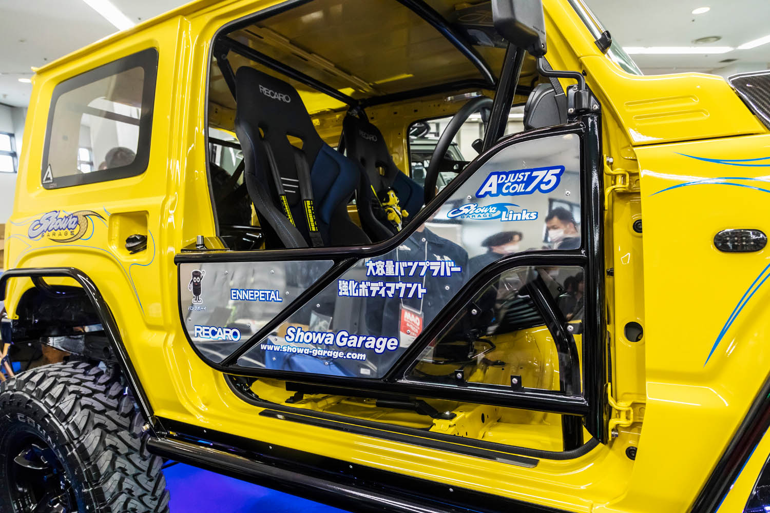 The Jimny on display at the booth of Showa Garage in Aichi Prefecture, renowned for customizing Suzuki vehicles such as the Jimny and Every, had a distinctly different aura from the other vehicles. Painted in a vivid yellow, different from the genuine kinetic yellow, the body was in a rather wild state, with the doors and rear gate removed.