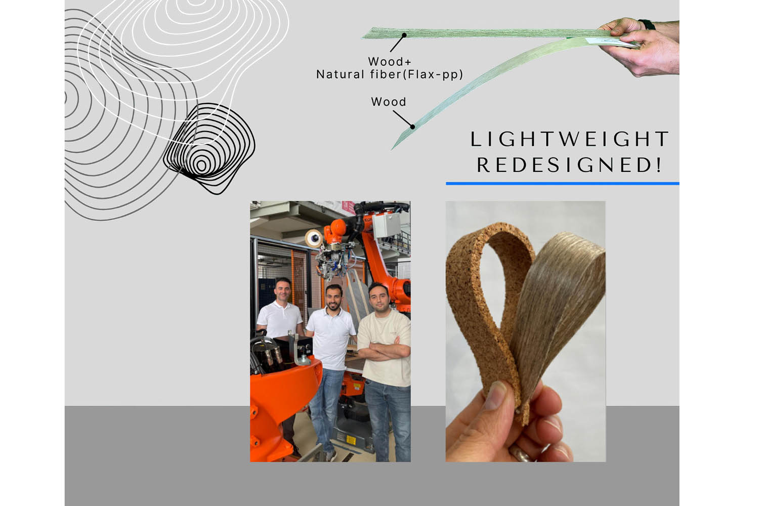 CompositeEdge used natural fiber composites such as flax and hemp fibers mixed with plastics to minimize the amount of material used, and without the addition of adhesives, to form a high-performance structure for automated manufacturing of automotive body panels, interior trim, chassis components, suspension elements, etc. The use of natural fiber composites significantly reduces CO2 emissions and energy consumption compared to synthetic materials. Overall, the technology enables the manufacture of sustainable lightweight automotive components.