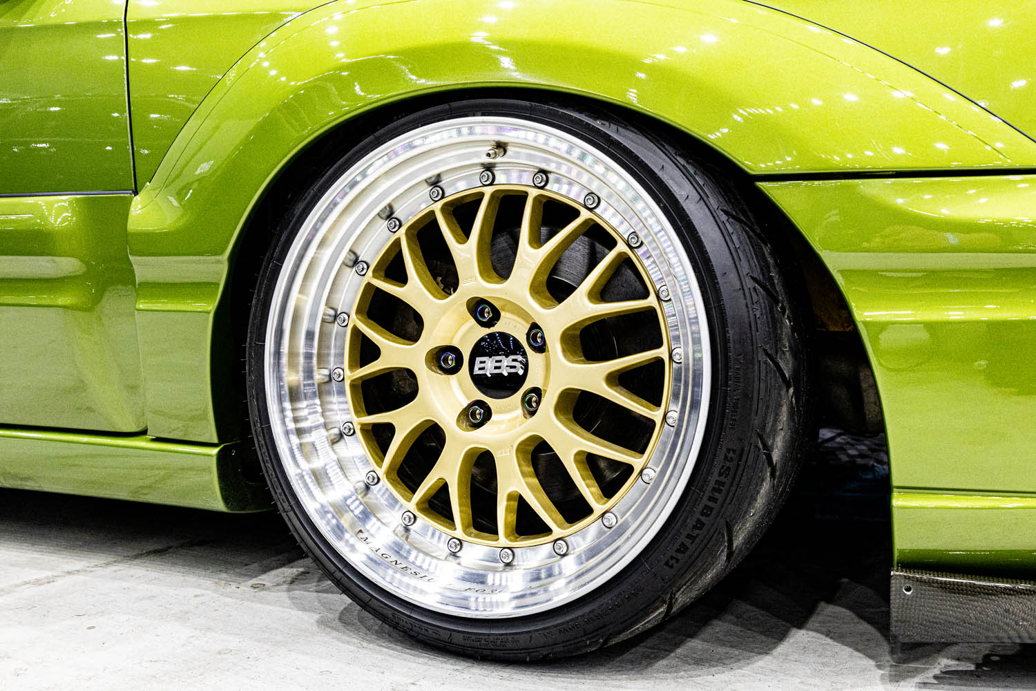 The rear suspension is an external full arm with Cusco coilovers, and the wheels are the rare BBS Racing GT II wheels. All of these modifications were made to convert the Baja into a drift vehicle.