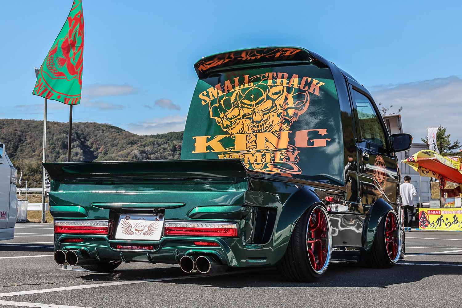 The back portion of the rear cabin is a special panel made of FRP, to which a sticker of “Yashi’s team,” the “KING FAMILY,” has been attached. This team is famous for its members who all drive high-level custom light trucks. The team is also known as a team that enjoys adult customization to officially approved specifications.